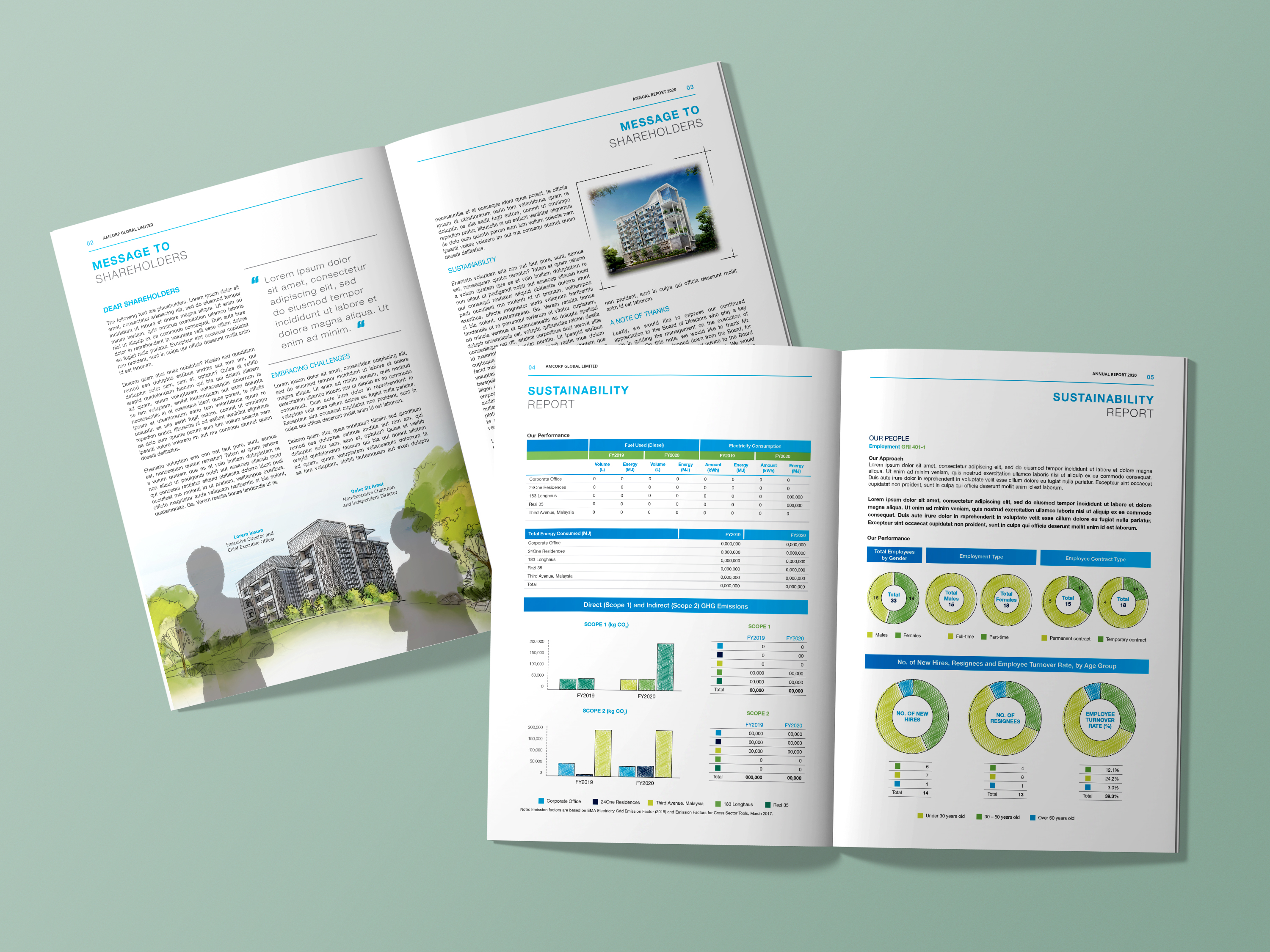 Annual report design for Amcorp Global Limited, a property development company. The 2020 publication opens with a striking cover illustration — a detailed architectural sketch of a residential development set within a lush, watercolour-washed landscape — giving the report a fresh, distinctive character that sets it apart from conventional corporate publications. The interior maintains a clean, professional layout anchored by a teal and green palette that reflects the brand's identity. Spreads include a Message to Shareholders section with editorial typography and property photography, and a Sustainability Report featuring structured data visualisations — donut charts, comparison tables, and GHG emissions graphs — designed for clarity and readability across dense financial and environmental data.