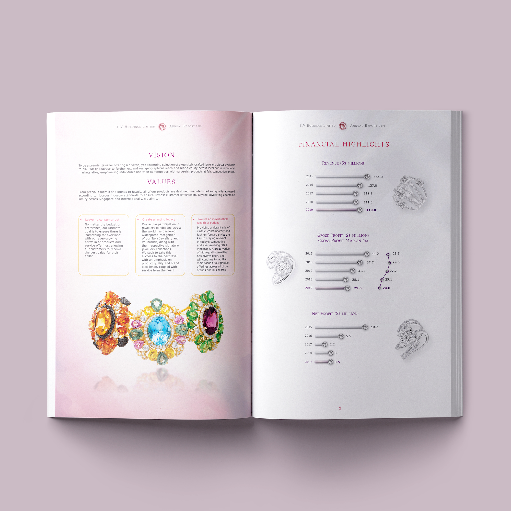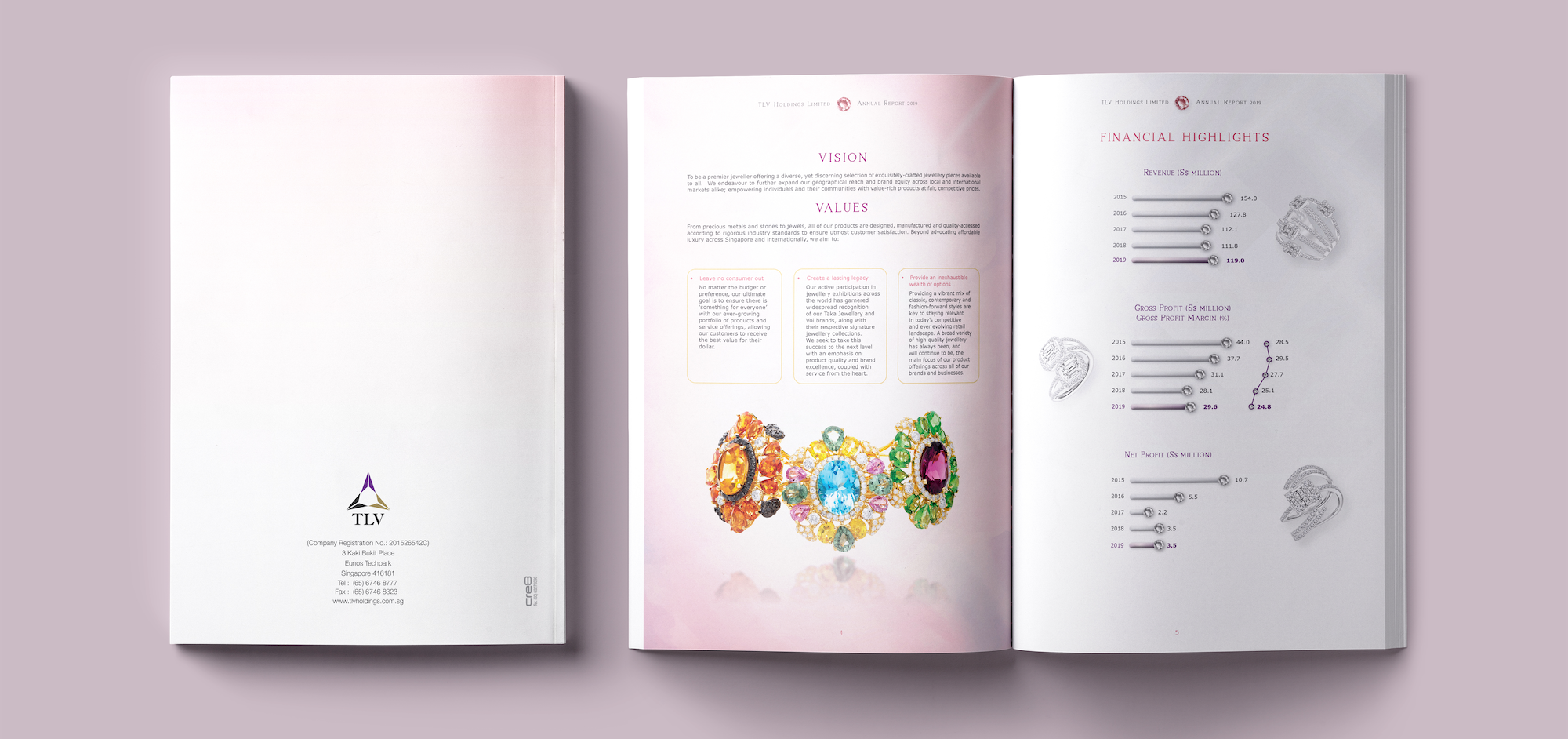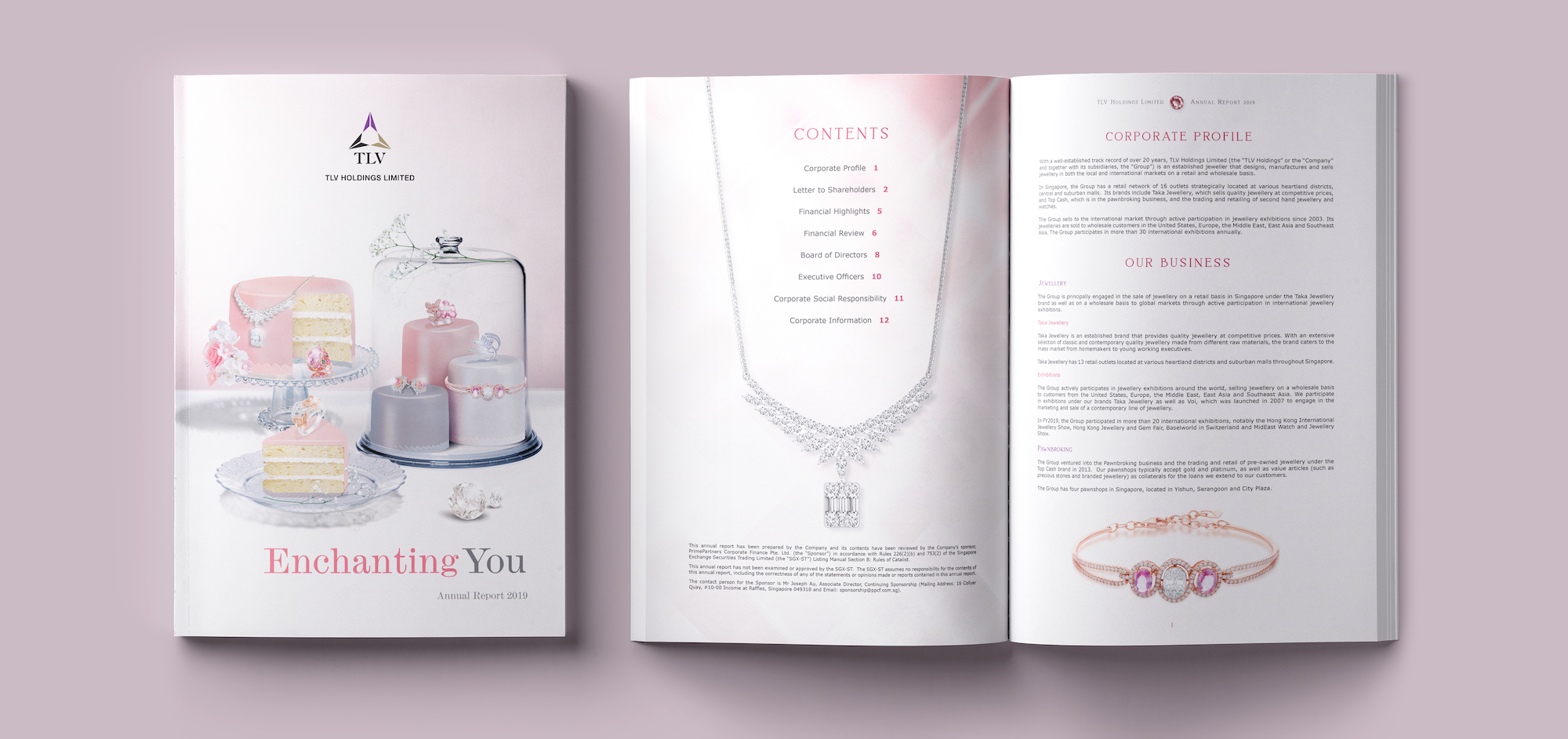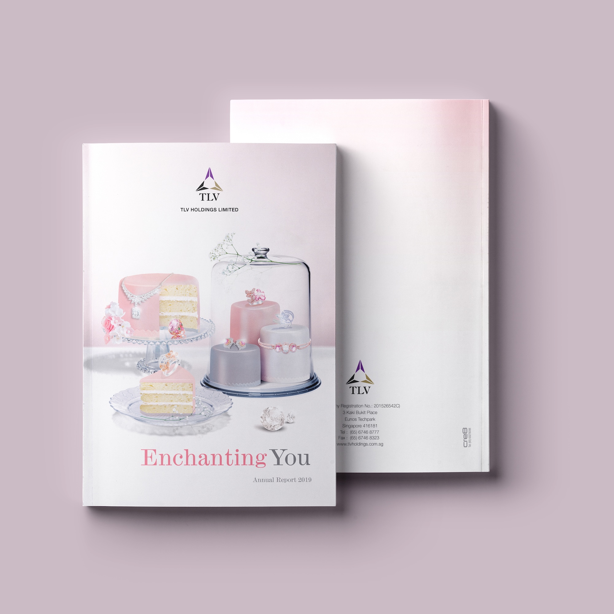 Annual report design for TLV Holdings Limited, a Singapore-based jewellery company. Themed "Enchanting You," the publication carries a soft, elegant aesthetic built around a blush pink and mauve palette that mirrors the brand's refined identity. The cover features delicate jewellery and cake imagery to evoke luxury and femininity, while interior spreads maintain a clean, editorial layout with generous whitespace. Product photography is woven throughout, from diamond necklaces to vivid gemstone pieces to keep the visual narrative cohesive across the Corporate Profile, Vision & Values, and Financial Highlights sections.