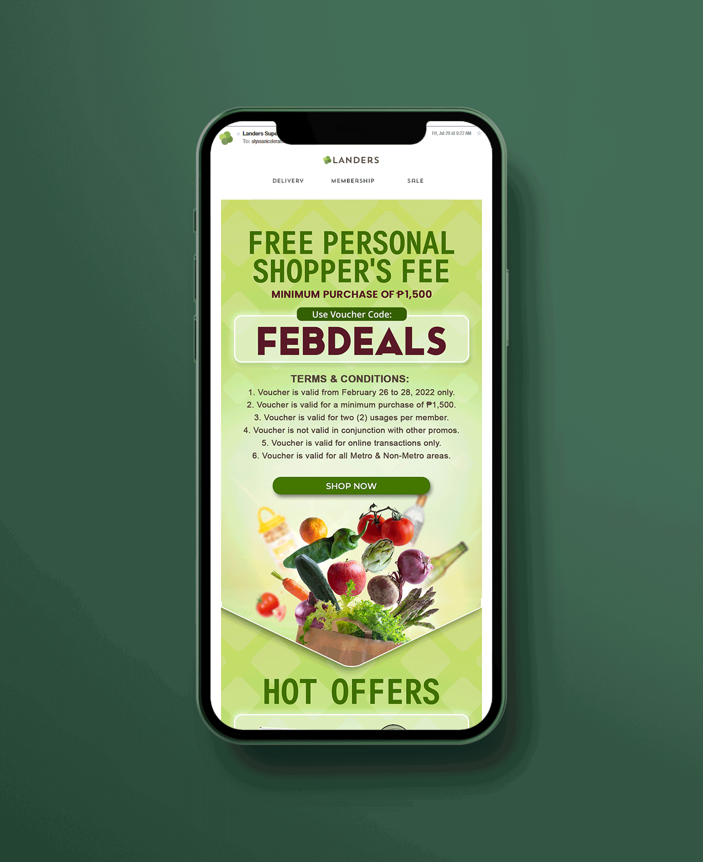 A promotional email newsletter designed for Snapmart's February 2022 campaign. The layout features a clean, fresh green color palette that reinforces Snapmart's grocery brand identity, paired with vibrant product photography to draw the reader's eye and encourage engagement. Hierarchy was carefully considered, from the bold headline down to the call-to-action button to guide the reader through the content in a clear and visually appealing way.