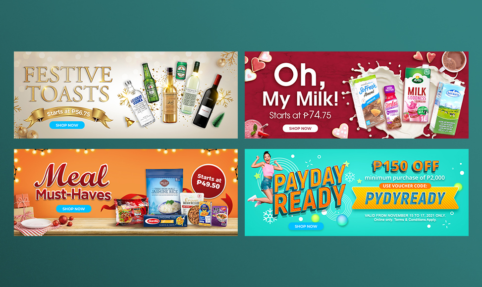 A series of seasonal promotional banners designed for Snapmart, adapting the brand's fresh, grocery-forward identity into a festive campaign context. The designs use Snapmart's signature green palette as a foundation, layered with vibrant product photography and bold, hierarchy-driven typography to draw the eye and communicate promotions quickly. A careful balance was maintained between seasonal energy and brand consistency — ensuring the banners feel celebratory without straying from Snapmart's clean, consumer-facing aesthetic.