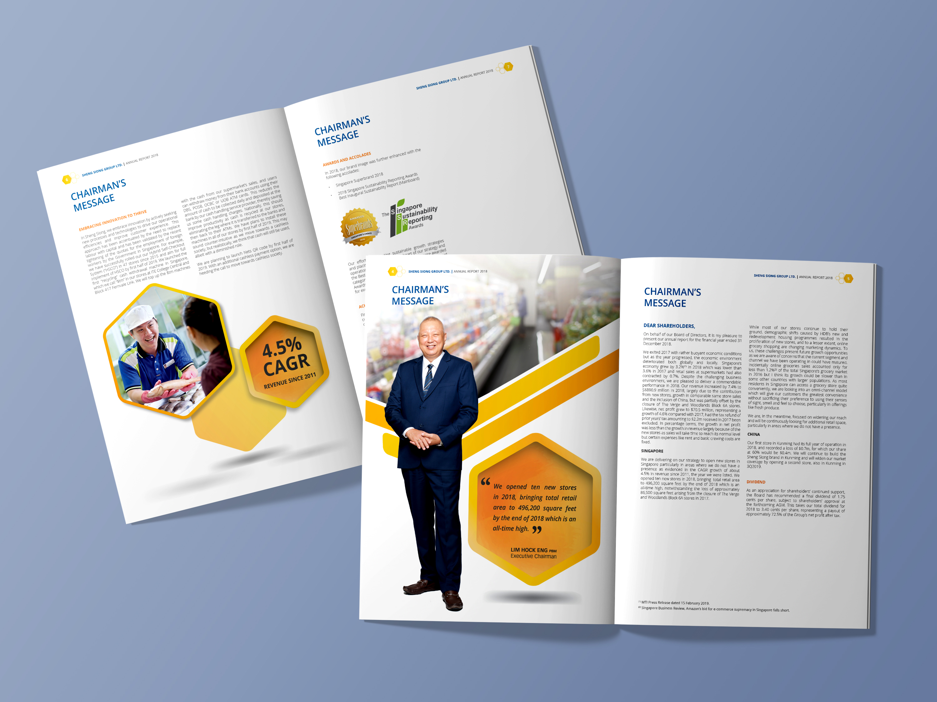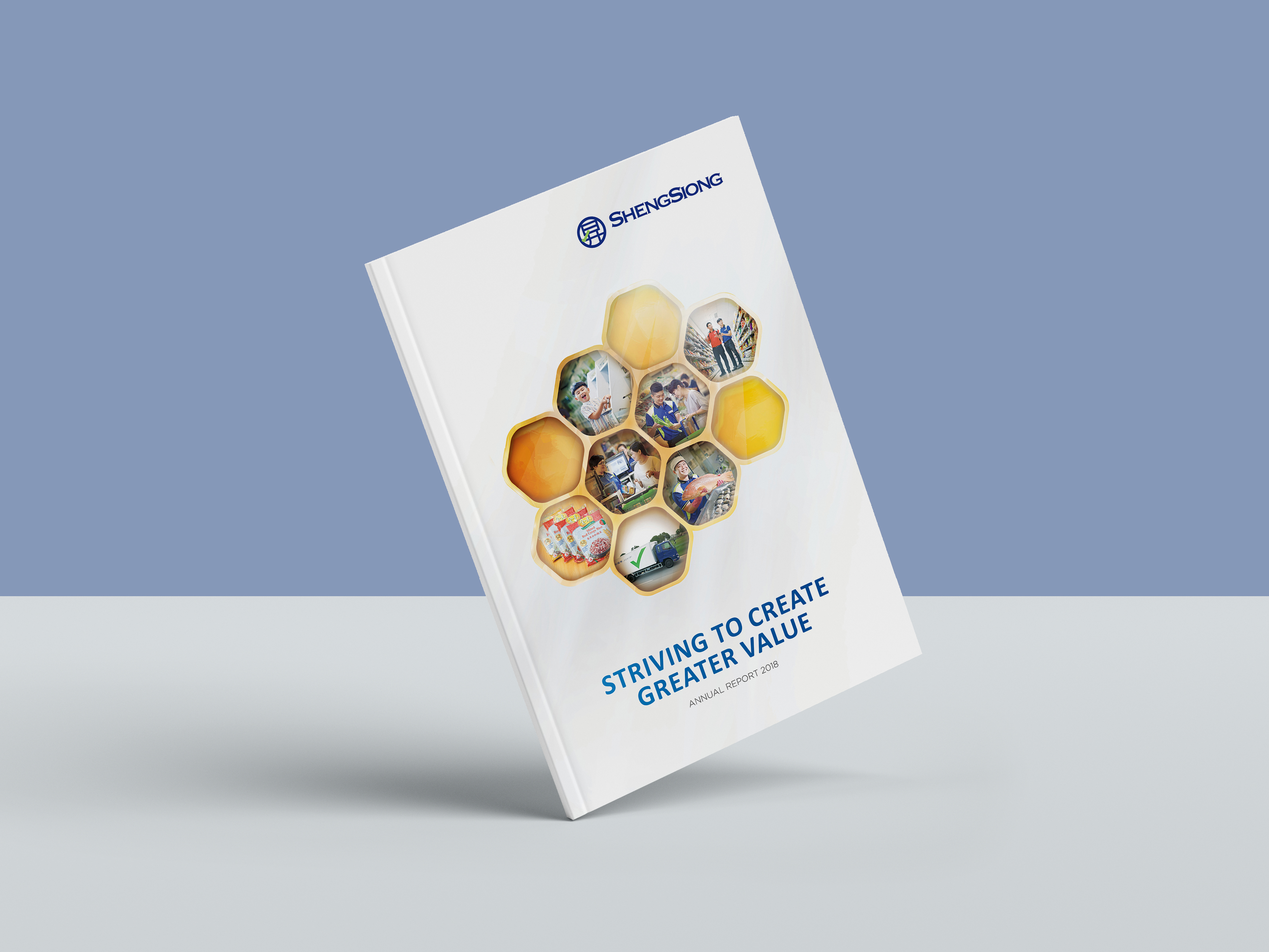 Annual report design for Sheng Siong Group Ltd, one of Singapore's largest supermarket retailers. Themed "Striving to Create Greater Value," the publication uses a clean, corporate layout anchored by a blue and gold color palette that reflects the brand's established identity. A recurring hexagonal motif is used throughout — from the cover's honeycomb image grid to interior section dividers — giving the report a distinctive and cohesive visual system. Lifestyle and product photography are integrated across the spreads, from in-store customer moments to full-page housebrand product showcases, balancing the report's corporate tone with a warm, consumer-facing feel.
