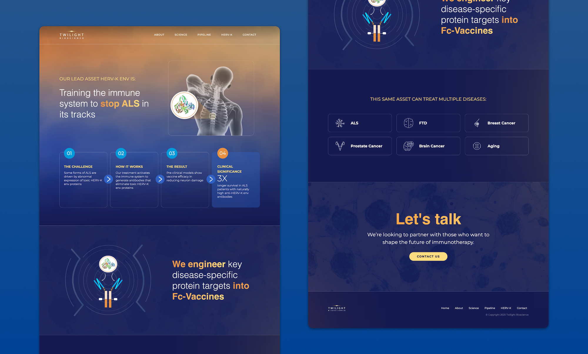A web page design for Twilight Biosciences (TWL Bio), a biotech company developing active immunotherapy for chronic diseases. The HERV-K program page communicates the science behind the company's research into Human Endogenous Retrovirus K — a retroviral sequence linked to ALS and other complex conditions — in a way that is clear and accessible to both scientific and investor audiences. The design balances the weight of cutting-edge clinical research with a clean, modern layout, translating highly technical subject matter into a compelling and navigable digital experience that supports the company's credibility and mission.